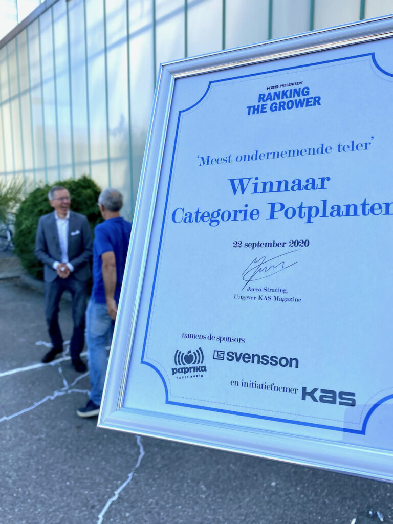 Fachjan is the proud winner of the ‘Ranking the Grower’ 2020 award, in the pot plant category. The prize was presented by Jacco Strating, publisher of KAS-magazine, during a festive and musical event held at our premises.